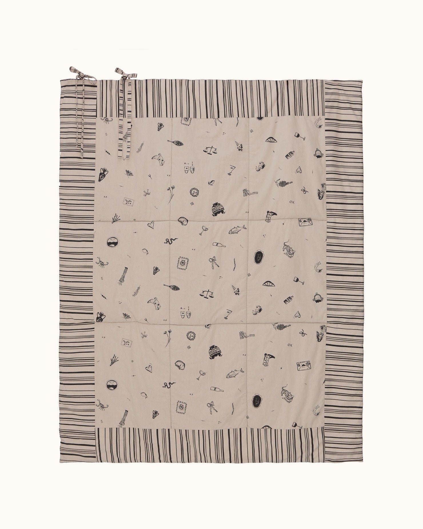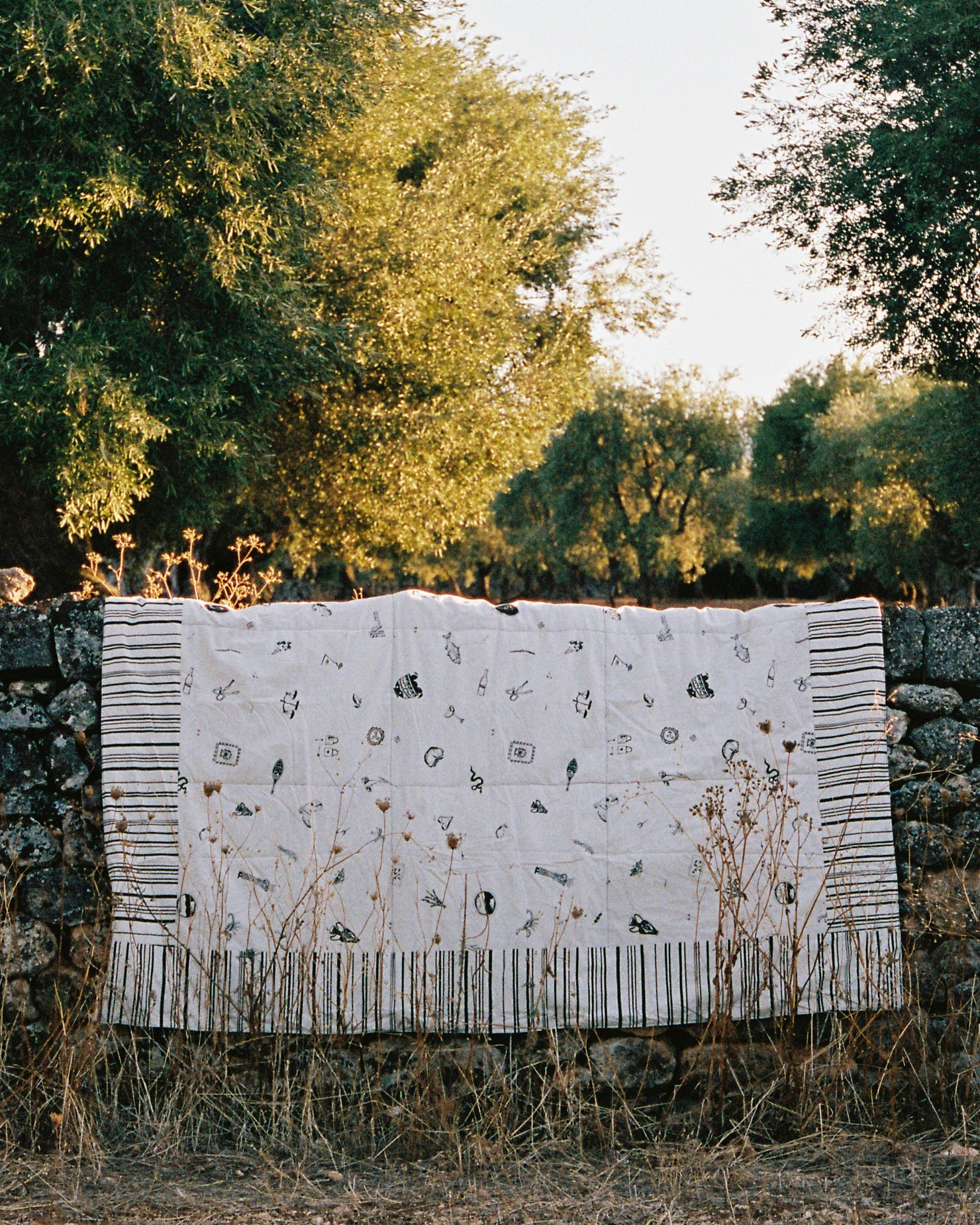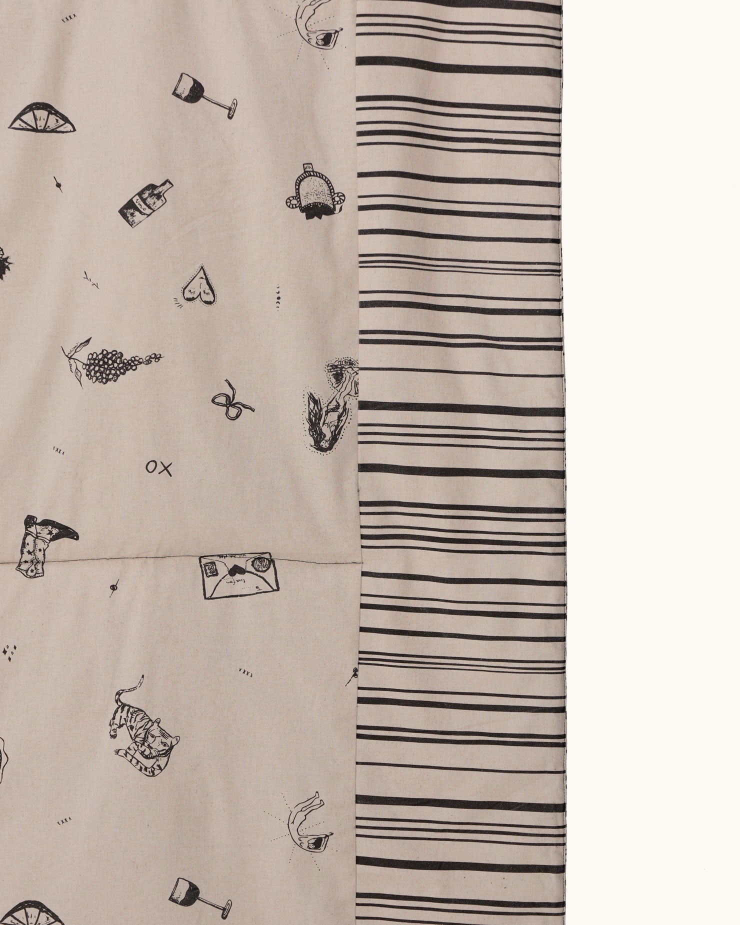 This beige linen colour-way is made from our collaborative print with artist Brigitte Grant, or B.G Studio, featuring more than 50 hand-painted illustrations. Each of these icons was arranged into an exclusive pattern and digitally printed onto natural flax linen, and finished with a wide striped border.